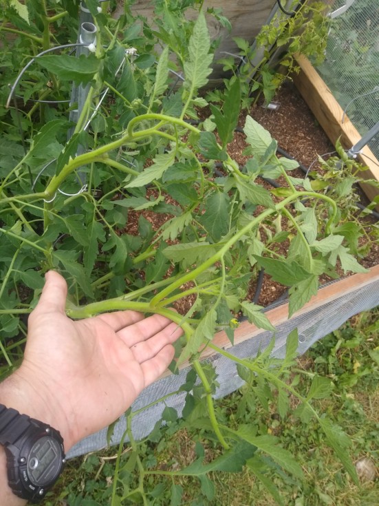 The Lyons plant divided into two twin main vines. I have been patiently waiting for the next flower truss on each stem to decide which one to trim off. Well.....both stems had produce a mega....(sigh)