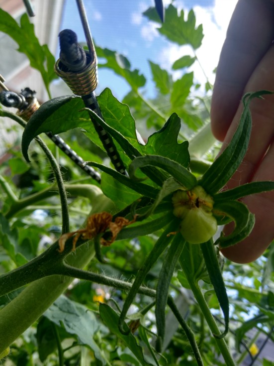 Tomato on the Strickler plant. It is weird shaped. It will be interesting to see how these two tomatos turn out as they get bigger.
