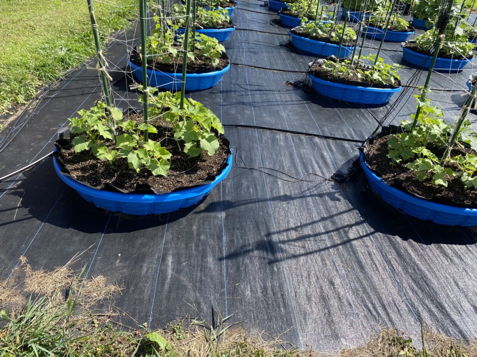 This is a trial that they are running at the ct ag experiment station in Hamden. They are trialing different growing media for rooftop or urban gardens. The cucumbers in the picture are being grown in 100 percent compost. They look to be a bit stunted and yellow compared to those grown in pro mix bx. See next entry