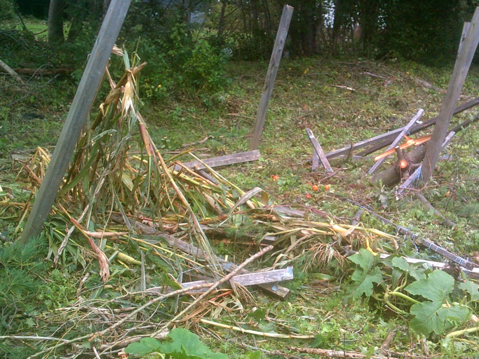 As you can see my corn is not as tall as it was but there was still a few tomatoes left. My 2 small pumpkins that were there somehow got missed and house did not get damaged