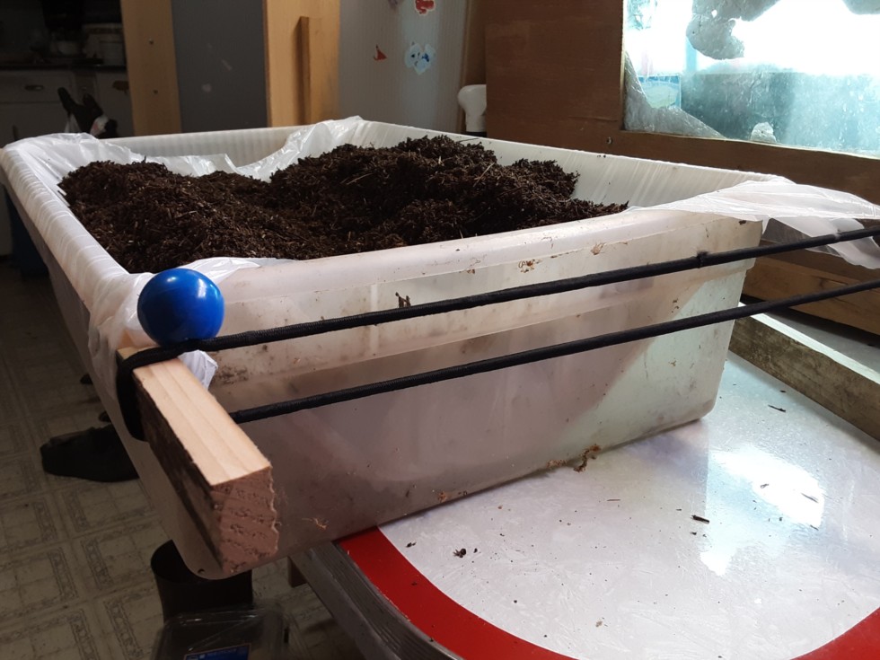The dirt is in a plastic bag/ wood stick medical stretcher. The idea here is that after its planted in a shallow depression I will be able to pull the plastic out, by pulling the bottom layer of plastic which will peel the upper layer out from under the pumpkin plant, and not move or harm the roots.