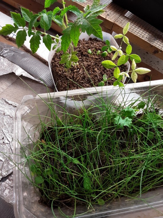 Two yellow/golden chain trees from the seed exchange sprouted which is cool, although I think I planted around 10 seeds. They are showing a severe iron or zinc chlorosis whereas the tomato looks to be ok.