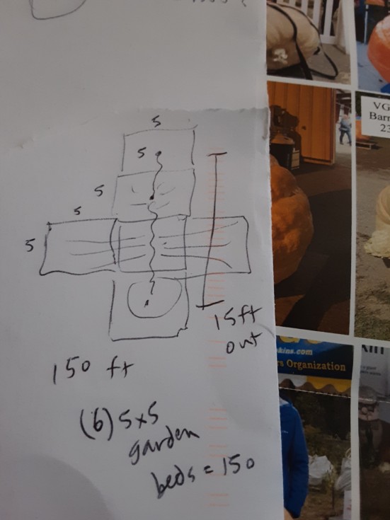 Using the envelope the SNGPG newsletter came in to sketch out a possible 150 sq ft solution. I have plenty of indestructible 5 ft cedar to make square garden beds.