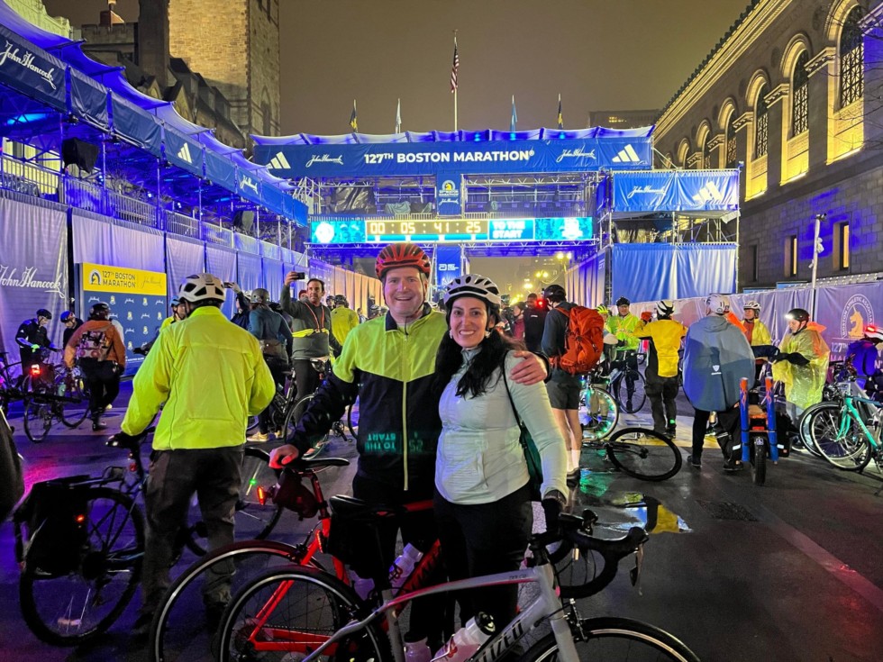 Boston Midnight Marathon Bike Ride. Our first year doing this ride. The picture is at the finish line on 4/17/2023, 2:20am.