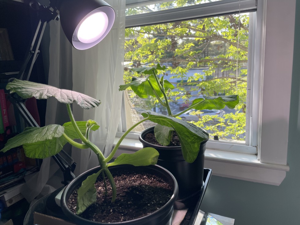 A combination of the grow bulb and sun. Are we getting a bit leggy here? Perhaps. I am working on gently angling the main vines down to make transplanting easier. This is kind of an experiment as it will be 5-6 weeks or so from seed starting to outdoor transplant. Since germinating these plants have been kept at indoor temps generally in the 60s-low 70s.