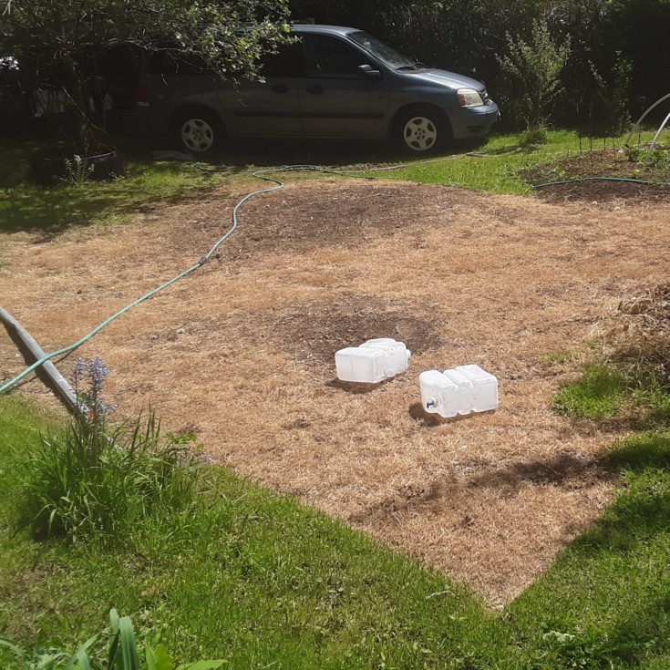 Solarized a spot here in case I need more garden space. In this picture its sharply apparent where the heat was! It helps to seal the edges with something to hold the plastic down so the heat doesnt escape. Even a 1" gap lets a lot of cold air in/ heat out. And a summer weather sidenote, don't leave pets or children in a car with the windows up. This shows clearly what will happen.