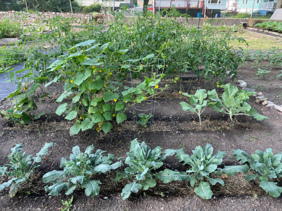 Vegetable garden looking West. The mulch does make trench watering a bit more involved, but we really wanted to maintain moisture while we were away. We generally use a lot more water than some of the other gardeners.