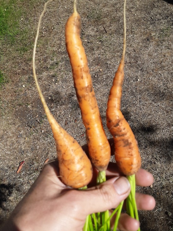 Seed exchange carrots turned out good enough. Genetically, it was a mix of Chantanay (left) & Nantes (middle) and a hybrid/off type? (right).