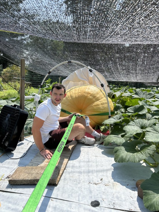 Yesterday my friend Jordan and I moved the pumpkin back. I used an old foam mattress topper as padding between the strap and the pumpkin. We used a couple of pieces of rebar hammered into the ground as an anchor for the ratchet. It went relatively smoothly. The pumpkin has outgrown its initial mill fabric pieces so hopefully It doesn't have to be moved again.