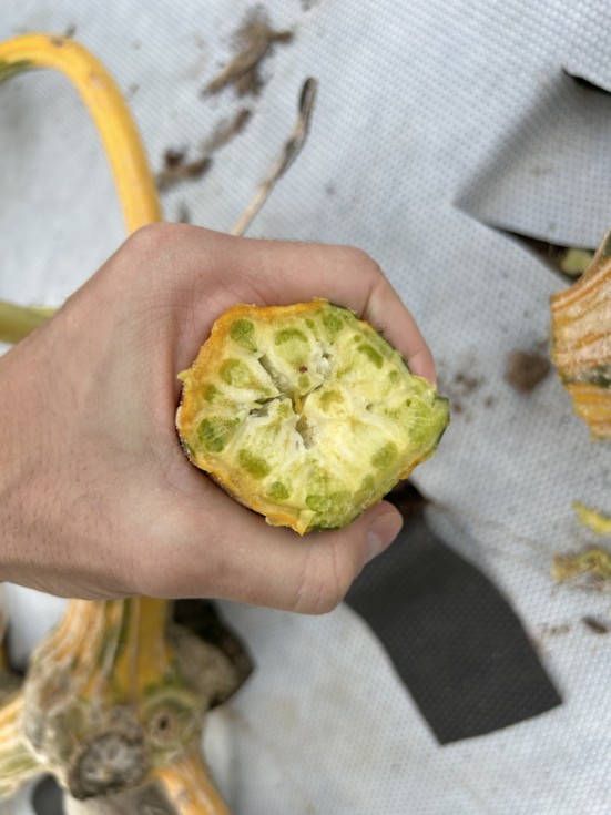 Here's the main vine cross section a few feet from the pumpkin. This confirms what I already knew. The rot started in that soft spot on the stem from the tendril, not from the soil/vine itself. While I obviously would have preffered that to not happen, it just shows that all of the efforts I made to fight the fusarium that got me last year worked! Next year I'll cut the tendril and leaf at the pumpkin as soon as I'm sure of pollination.