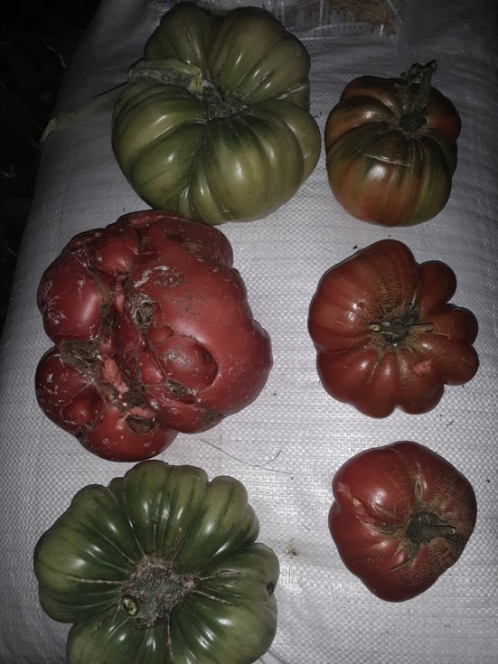 The tomatoes on the right were grown in close proximity to the disappointing 150 sq ft 1448 Bongers plant. Comparing these to the normal sized giant tomatoes on the left, I can see that despite some effort the soil has not been dialed correctly here. Indeed, the pumpkins all failed to achieve a normal & sustained growth rate. The beans produced minimally as well. I dont know what the culprit is. The only symptom is small fruit... and there should have been plenty of potassium and calcium. Could it all just be poor soil biology?