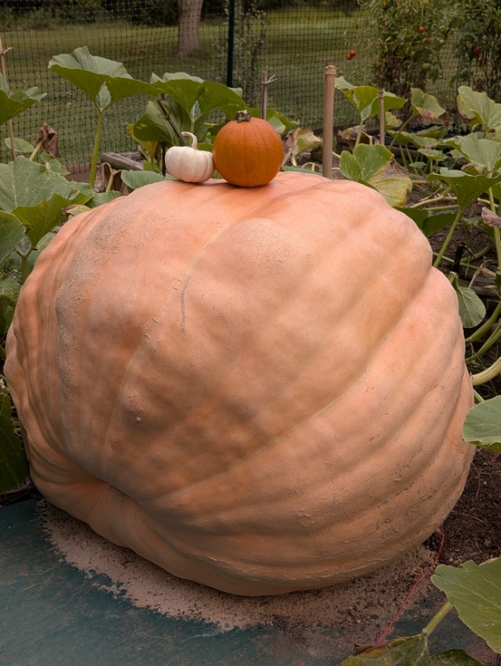 1526 Miller still slowly putting on the pounds at 78 DAP, roughly 3-5 lb per day over the last 10 days. Measured OTT 310 today (699 lb). Only about 1/3 of the original vine and leaves are somewhat healthy looking, the rest succumbing to old age/powdery mildew and squash bugs. The pumpkin itself looks great, no cracks at all in pumpkin, stem, or nearby vine.