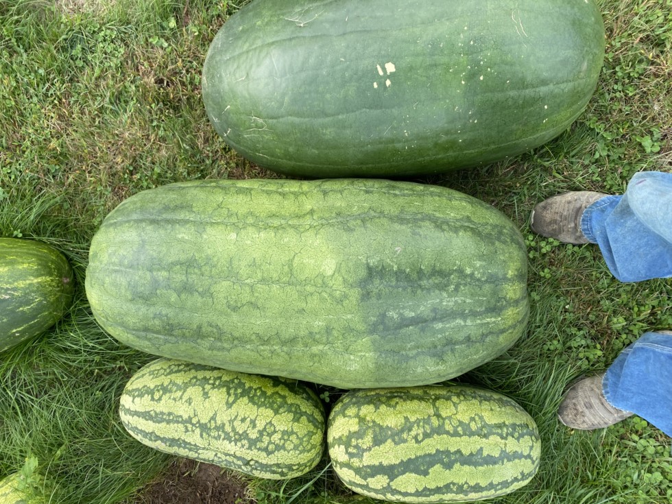 These were the two melons I brought to the Durham fair. They are Tom Watson crosses. They are pictured next to 2 30 pound jubilee melons Final measurements on the long melon 57 inches end to end, 38 inches side to side and 91 inch circumference for a total of 186 inches. on the black melon end to end was 53 inches, side to side was 39 inches and the circumference is 82 inches for a total of 174