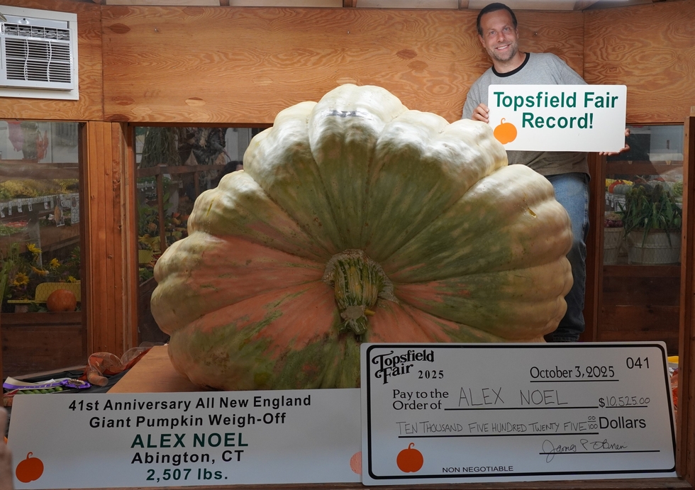 Alex continues to push the state record to new levels and has replaced both his past state record weight and also his personal best weight on a certified weigh-off scale with this pumpkin! As a result, he also set a new Topsfield Fair Record and is an official New England Record.