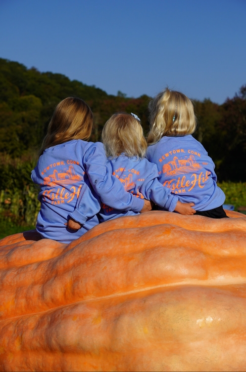 It is always amazing to realize how many lives growing giant pumpkins can touch. Here is a great image that does not even show most of the pumpkin, but offers a great fall time farm image. I met the main farmer many years ago, back before these kids were even born and now, I am able to share with him and his grand daughters the one pumpkin I grew, compared to his many acres of pumpkins.