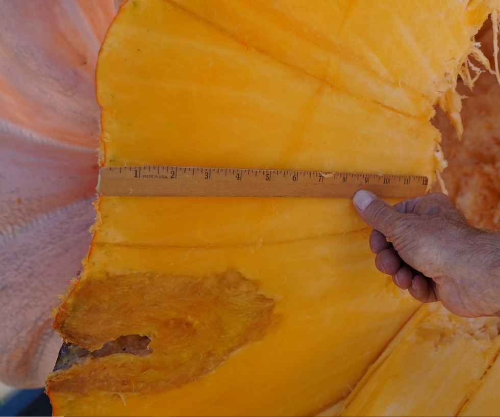 It can be difficult to get images while in the moment of cutting the pumpkin, but this shows the only soft spot on the entire pumpkin and also the thickness in the area of the issue. While there is more soft tissue around the hole, this is in part due to the extended post-harvest showing of the pumpkin and lack of any treatment after this time. With any problem you never know how bad it actually is and seeing this now, there was plenty of pumpkin meat left before the cavity was compromised