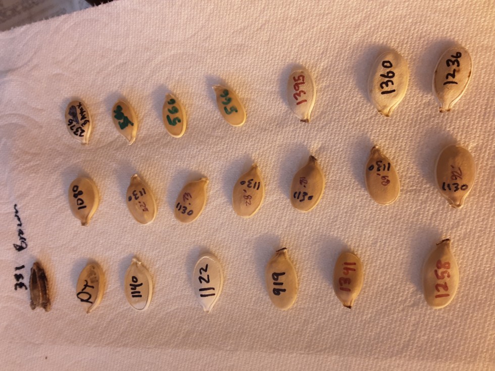 The lineup. Biggest is a 1395 Wallace. Things were a bit lighter 15 years ago. I added a 2376 Bayuk 2001 as a control. And the Brown bushel gourd for fun. Neither counts as an old seed.