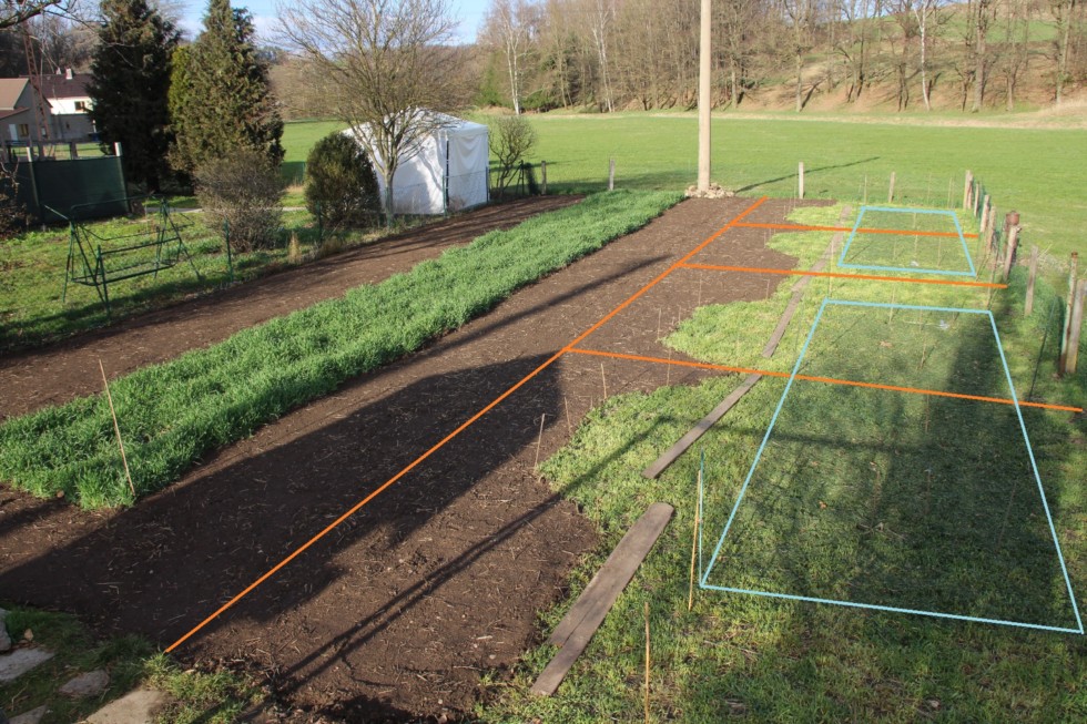 So, here is my plan for my 2026 patch layout. This year I want to grow 4 squash plants, and each plant will be contained in one of the four orange rectangles. The mustard-areas inside the rectangles will be free of mustard after beginning of June, so that the squash plants can use that space as well. The other cover crop areas will then grow another cover crop (tagetes, zinnias, and some other stuff). The long rye strip will be rye for another two weeks, and then there will be three rows of potatos. Last but not least, the rye leftovers inside the orange areas will be shaved off (1 - 2 inches thick) and will be piled up inside the blue rectangles. The blue-framed areas will then be covered with clear plastic for some weeks, they will be the planting sites this year.