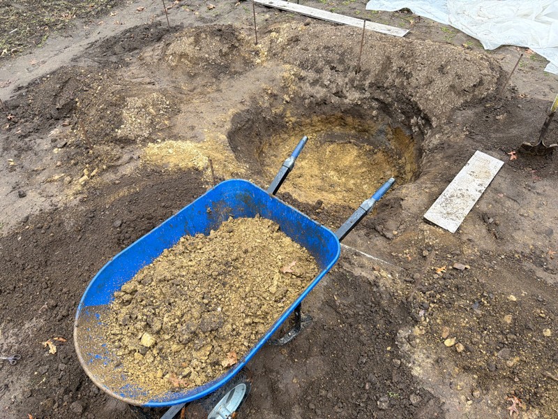 That's a lot of clay! I'm removing the most I can from the 3 foot hole. Will fill back in with loam and pro mix. This is where the 2731 stelts will be going! Those roots will have a big advantage compared to the other hoop. Deep hole with loose soil!
