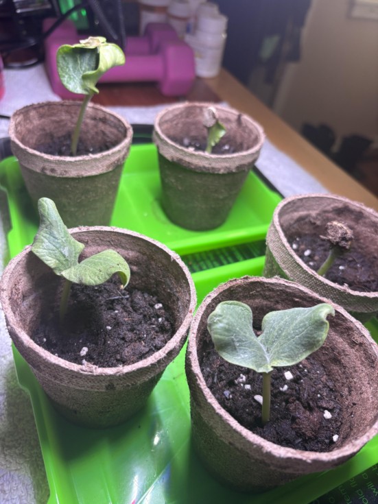 Making progress! I couldn't figure out what was going on with my wrinkly leaves and Google told me it was from overwatering, yet the soil was always bone dry and the plants seemed to be shriveling up. I decided to try and drench them until the peat pots were draining water from the bottom and see what happened. I was rewarded with huge improvements to the leaves and tons of tiny white roots sticking out from the bottom and sides of the peat pots this morning! The leaves of a couple have started opening up and spreading a bit, I can see a tiny first leaf forming in the center of one of them. The biggest one (And I thought the most robust) is still struggling to shake off its seed casing and is growing a lot but unable to spread it's leaves. I debated pulling off the rest of the casing to help it out, but I'm worried that doing that would cause more harm than good. Of the five I planted, four have at least one or two thick roots showing, two have spread out their leaves and seem to be thriving, one is being subdued by its seed casing, one has a complete seed still stuck on top of the leaves but is growing and rooting and one is tall, has the seed still completely encasing its leaves, has no visible roots and seems to have stopped growing. So I think I have four that could be viable, but only two are showing real progress. I'm hoping that the other two that are progressing with their seed casings still on will eventually grow out and become viable, too, but I'm already planning on planting backups, so it's possible that I'll only wind up with two good plants from this bunch.