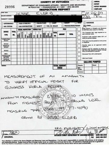 New York state gardener/farmer Jesse Eldrid specializes in growing heavy, tall, and large vegetables and annual plants. On October 25th, 2007, after a long summer of working, watching, and waiting, he finally contacted county officials in order to obtain a legitimate measurement of the Amaranthus Australis plant he had been growing since the beginning of the year. When Jesse contacted the local bureau of weights and measures, he knew that he had a record-breaking plant -- but he didn't know that his plant would be almost twelve feet (11.98) taller than the the goal he had set for himself in the existing record: the official measurement of the plant, he would learn that afternoon, was 27'10". In the early Spring months of 2007, Jesse received several amaranth seeds from the USDA NCRPIS (United States Department of Agriculture, North Central Regional Plant Introduction Station). Although one wouldn't think it from the size of the mature plant, Amaranthus seeds themselves are actually quite small (smaller than the head of a pin.) Germinating them was fairly difficult, however. Once he managed to get a handful of young plants growing well, he knew one of them was destined to be huge. On May 15th, when Jesse transplanted the young seedlings outside, they started growing rapidly. The plant that grew the fastest also happened to have the largest trunk (measuring almost five feet around) which may have helped the plant grow significantly taller than normal. (An average "trunk" would have a five to eight inch circumference.) As the temperatures rose, the plant grew faster and faster. Competition, too, was on the rise. In Spring, Jesse shared a small number of cuttings among friends, and their plants had begun to take on considerable height at around this time, as well. As it turned out, many of these cuttings exceeded the 15' benchmark, some even stretched to 20+ feet. In the early autumn, near the end of the amaranth's life cycl