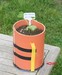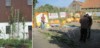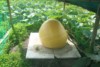Finally I removed the sticks at the red-arrow and blue-arrow positions and I placed something under my pumpkin. In this case it is a sheet of styrofoam, where I cut a good number of holes in, and then I covered it with fine sand. You see that I placed this sheet of styrofoam in such a way under the fruit that there�s much styrofoam at the stem side of the fruit. Reason is, the fruit will grow in all directions. At the blossom end I can easily add another sheet, but as the fruit grows and the vines in the back of the fruit turn into a dense jungle it will be impossible to add more styrofoam at the stem side of the fruit.