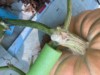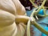 9 DAP. Perceptible gains. Feeling heavy when I lift it and relieve the stem pressure from the vine. I am doing the last training to the pumpkin stem itself; inching the blossom end counter clockwise to get the pumpkin shoulders to that final 90 degree position relative to the vine. The blossom end looks good.