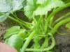 188 Treece Field pumpkin plant. Cobra plant has finally started settling down. Female flower starting to develop at end of vine.