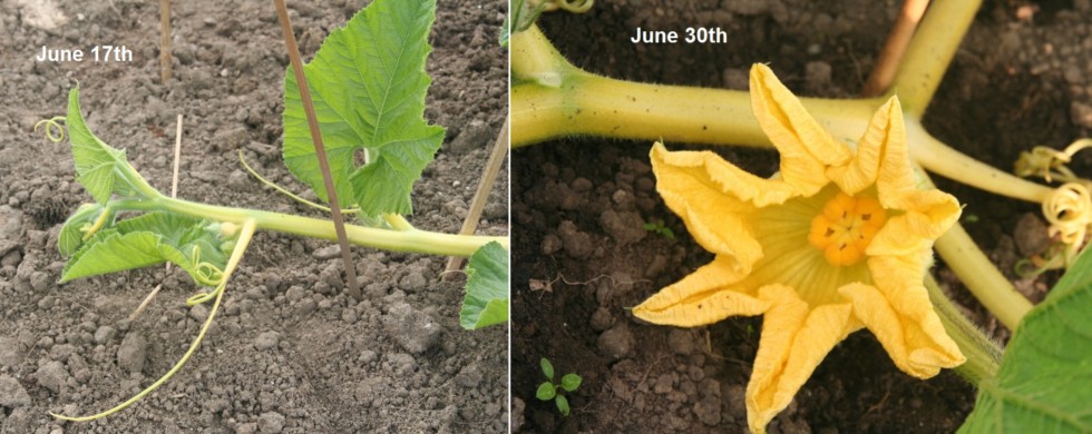 Today is a good day, it�s the day of my first pollination in 2014 :-). After a very warm April I had been dreaming of mid-June pollinations, but now June 30th was the first pollination out of a total of six plants. Have a look at the dates of the pics taken, now you can probably imagine how terrible our summer weather had been during the past weeks. I haven�t seen such slow development of females in the past (vine growth isn�t any better either). Oh, almost forgot, the cross is 1209 Shenoha x 1874 Mathison, main vine, 7 ft (correct, 7 ft and likely to become the keeper), 16 secondaries between fruit and stump...go figure!