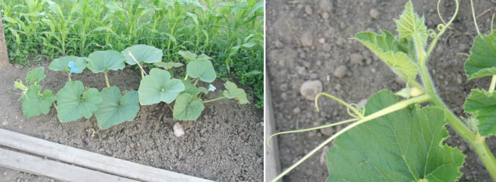 This is my 282 Scherber plant, seed started on 28th March, hence the plant is 3 months and 5 days old now...and has a main vine of 4 ft length. Even though this plant won�t grow my new PB I know that it had a very hard start into life and I�m glad to see that it wants to grow and turns into a real pumpkin plant. For genetics reasons (as a pollinator) it should be fine, I like the idea of having the 1725 Harp [2009 Wallace clone] x self as a pollinator in my patch. Also, there�s a little female at the vine tip, 4 ft should be fair enough for a little genetics pumpkin.