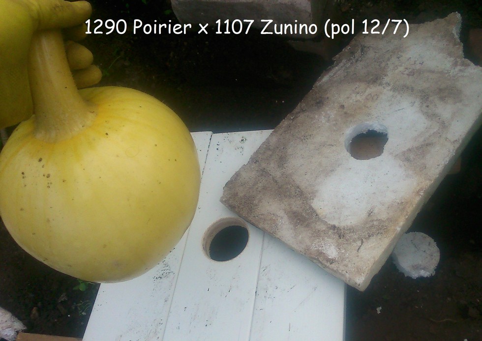 1290 Poirier - As per advice given I terminated the main at the fruit in order to ease growing it on its blossom end for beauty. Taking 7' of main vine off has left a 85 sq ft area of root zone and plant. Will train a side vine forward for additional plant growth. My advice for anyone doing this is to get the pumpkin set up before cutting the main since there was nothing to support it. This was a rush job as the platform I have made is obviously far too small but it will have to do for a week.