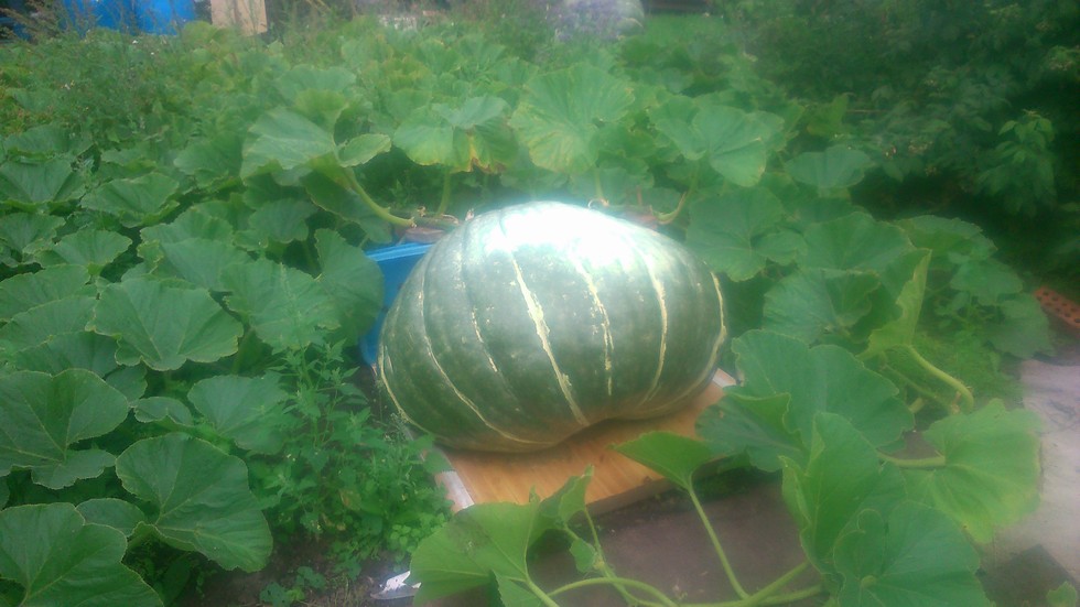 Thought it might be about time I showed the back end of the main vine 323 x self and she certainly has some big butt cheeks. The white patch on top seems to be taking on a minty green colour so I suspect it's finally colouring up although I seriously doubt it will match the rest of the squash. Very happy with this plant and on a better year weatherwise and with just a single fruit I am sure this one could produce something notable. (Thanks Gene!)