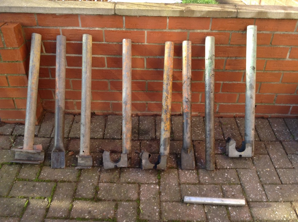 Pictured are eight of ten 27" inch ground tubes. The bar on the floor is 32mm galvanied steel to be used for the five 14' wide hoops, each of which will be comprised of three peices. These are currently being made to order by a local metal worker. The plan is to concrete the pictured tubes to a depth of 18" with 9" above ground for the hoops to slide into. Hoops will be attached to each ground tube with two 6mm thick bolts. A template was made and attached to the top of each tube and two 7mm holes were drilled.