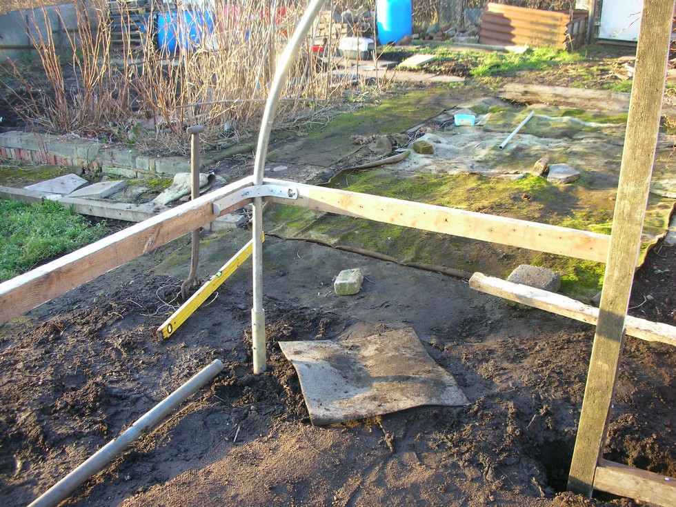 Step 10 - Starting with the door end, cut and screw one end on to the frame (use a suitable length of wood to prop the other end up if doing it by yourself and use this all the way round providing you are on flat ground). Attach the shaped bracket to the hoop using 25mm x 5.5 self tapping screws then attach the wood to the bracket with coach screws.