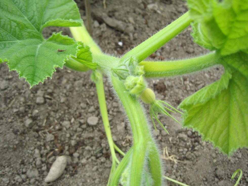 This is the first female on the 1223 Radach plant. Seems to be a freaky plant, just can�t get enough...1 female, 2 males, 1 tendril and 2 secondaries in one leaf node. Even though some sections of the main are flat and some of the first secondaries look like flat vines or clustered vine tips, the main vine itself looks pretty normal right now, so I�ll be patient and see what this plant will do the next 2 or 3 weeks.