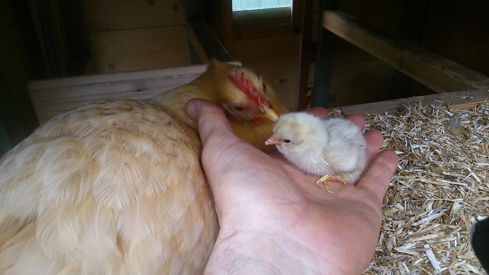Say hello to 'Lucky'. I opended the hutch this morning to see an egg jiggling about. Zachary and Sophiana got arrived just in time to see this chick literally bust out of her egg. Betsy (the broody that was on her) started to attach the chick at which point Coco (pictured), who couldnt see what was going on, instively knew and jumped over a 1 foot high divide to intervene. Sad to have to do it but Betsy was removed from the coop, she was a dedicated broody but turned out homicidal.