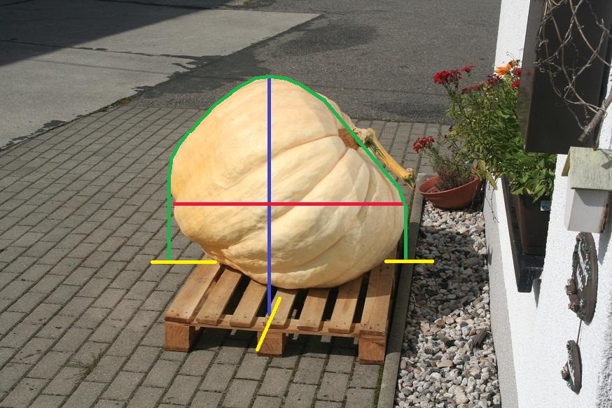 Every year the question comes up how to measure OTT. This pic shows the three measurements. - CC: WIDEST circumference PARALLEL to the ground (red line) - EE: Stem end to blossom end OVER THE TOP and with the tape going straight down to the ground (ground level indicated by the yellow bars) touching the ground at a right angle (green line) - SS: Side to side OVER THE TOP and with the tape going straight down to the ground (ground level indicated by the yellow bar) touching the ground at a right angle (blue line)
