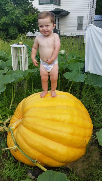 Here is my monkey (Sal) on top of the 575 Wolf pumpkin. DAP 43 and the OTT is 277.5 which is some where between 470-480 .Lbs...Nothing huge but I haven't fed this pumpkin anything at all other than straight water. The plant was fed early on but that stopped 2 weeks prior to pollination time ...the only sprays have been pesticide and fungicide ...Love the shape and it looks like it is going to be nice and orange...Hope we get seeds from this baby because I definitely want to grow a couple...The 575 Wolf has been a great plant also...by now I am usually dealing with PM and so far none,,,Great plant