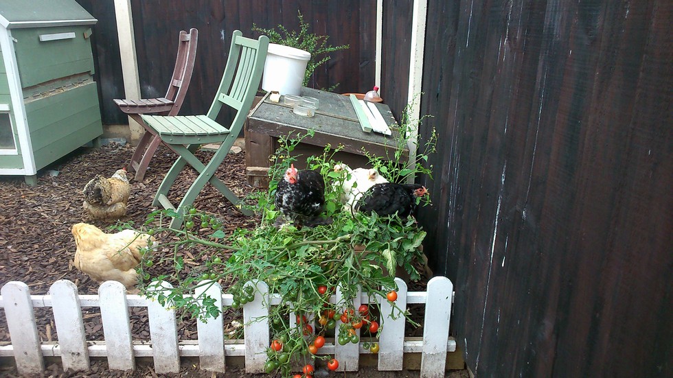 The only things growing this year are the chickens which have taken over this tomato plant. Out of 4 hatched chickens we have 3 hens and Neville the cockrel.