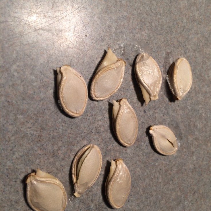 These are the seeds out of my 140 lb FP. It had the fattest field pumpkin seeds I've seen. Some did this. It's as if the seeds grew bigger than the seed coat would let it.
