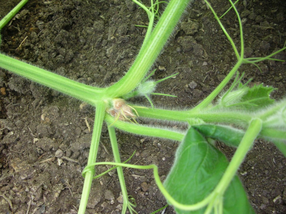 After hitting temps up to 109� I thought the worst was over. The 2230 Wallace didn't loose any leaves to burning up in the sun so I thought I had avoided any heat related injury to the plant, BUT...now almost every pumpkin on the main vine and secondaries are shriveling up and dying like the one in this picture. Also, plant growth was doing well right up until the heat hit but now the plant growth has slowed way down. I will give the plant every chance to recover but time is running out to start over if I have to so I started a few backup seeds just in case. I started this late once before and did OK but our September heat is brutal. On a side note, Jim's plant is still too young for females to develop but some of his male flowers are shriveling up and dying too. This is the first time I have seen heat do this to the plants.