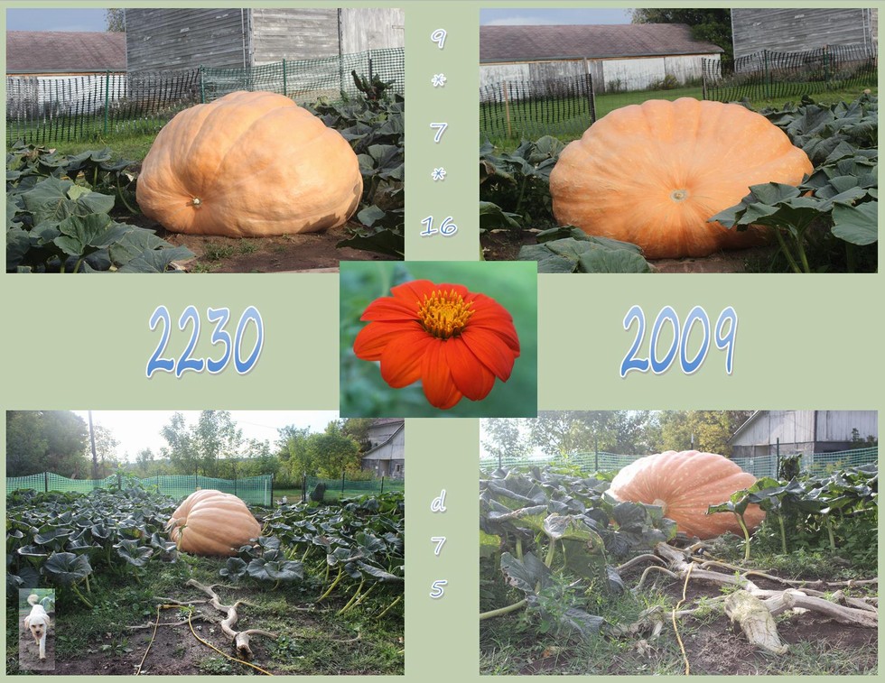 It would be nice to feel confident at day 75 but the rain and humidity persists. Here is the back and front side views of the 2230 and 2009 today. Both stems have some minor deterioration issues I have cleaned and put a fan on and will babysit several times a day. The 2230 has absolutely no powdery mildew but the 2009 has A LOT even though both have been aggressively treated the same. The 2009 leaves are huge elephant ears which overlap considerably causing the problem. I will continue to eliminate poor leaves. The 2230 @ 430.5 ott 1618# seems to have finally figured out I cut it's base/stump out over three weeks ago due to rot, but is still growing. The 2009 @ 439.5 ott 1697 seems to keep going well enough. The flower is a "Pumpkin Sunflower" seeds I grew this year :) My little dog Lucky (see him?) figured out how to get in the garden.