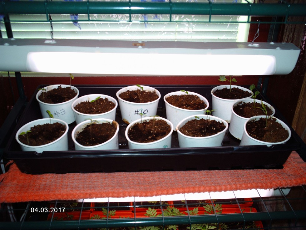The weather is rain on and off with a severe thunderstorm watch in affect until 10pm CDT and 66 degrees F. Update on progress: Tray is showing now 3 World Record Strain Giant Bell Pepper seedlings from 550g Nieuwenhoff. They are taking off on the right, but still slow. I have one Ghost Pepper seedling from Oglesby 2016. Waiting for a new leaf set. I have new Carolina Repear seedlings in new pots and they seem to be doing okay. The two cups with all four Trinidad Scorpion Morouga Yellow peppers from Garofano 2016 are doing well.
