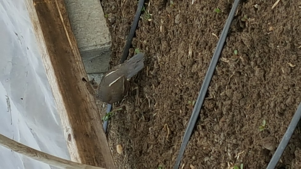 Lots of burying and pruning tonight. We had a windstorm last night and the 2307 got a twisted vine, so it's no longer a contender, and I'll keep the 2145 next to it. My most beautiful plant, the 2624's fan landed on its last 18" of main vine tip, but no damage was done-whew! On my final inspection of the hoops tonight, this guy scared me half to death! He was trying to get out and I was trying to keep him from flailing into the 2624 and 1844* plants! He managed to calm down, and I persuaded him successfully to the exit.