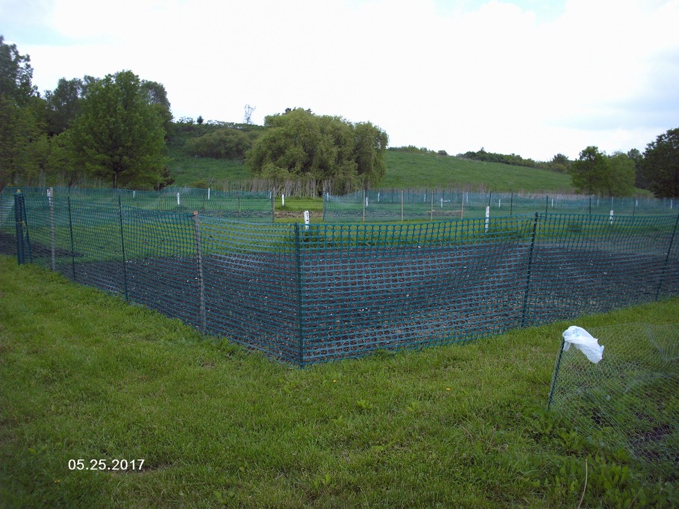 One of the many plots showing tree branches for stakes and green plastic fencing. As of June 3rd, nothing has been done to bring it into compliance! Amazing!