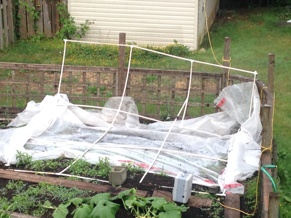 Came home from work to find this despite concrete blocks being used to tie the tent down. Fierce wind gusts. Pumpkin survived but we lost a couple leaves. Awful cold weather has put us behind many weeks. Perhaps it's a good year to let the patch go fallow this year.
