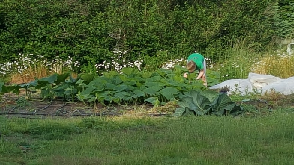 Rosalyn weeding and pruning her two plants.