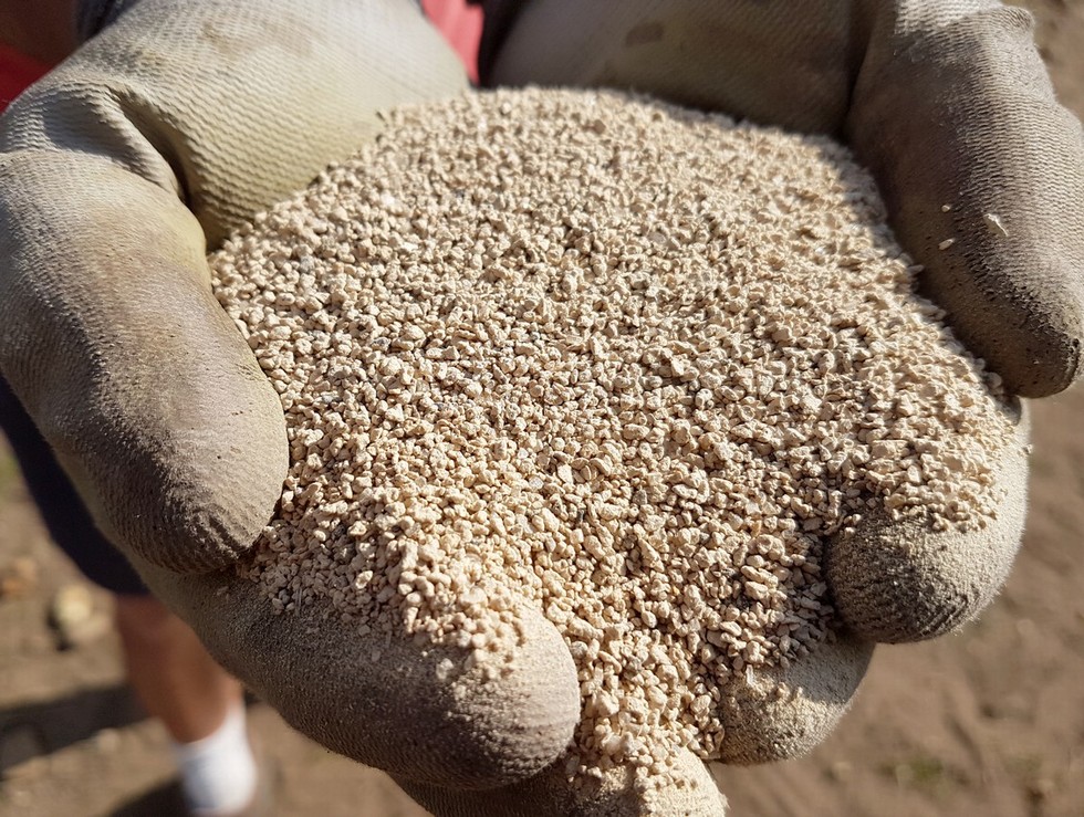 This is Z�olithe. Contains trace elements, increases Cation exchange capacity, retains moisture and minerals and slowly diffuse them in the soil.