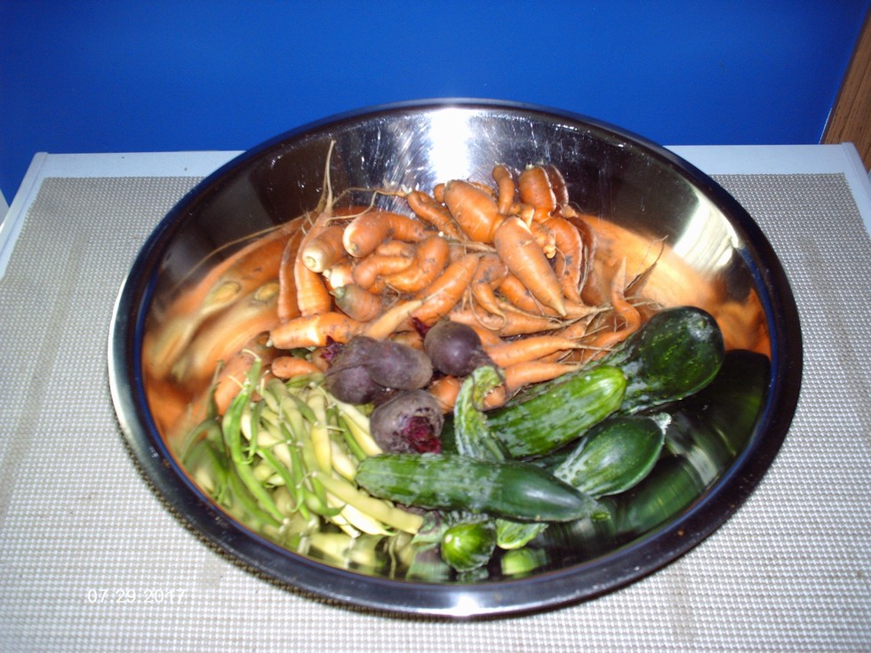 My first summer harvest from the backyard grow box! I hope the leaf curl on the tomatoes can be solved!