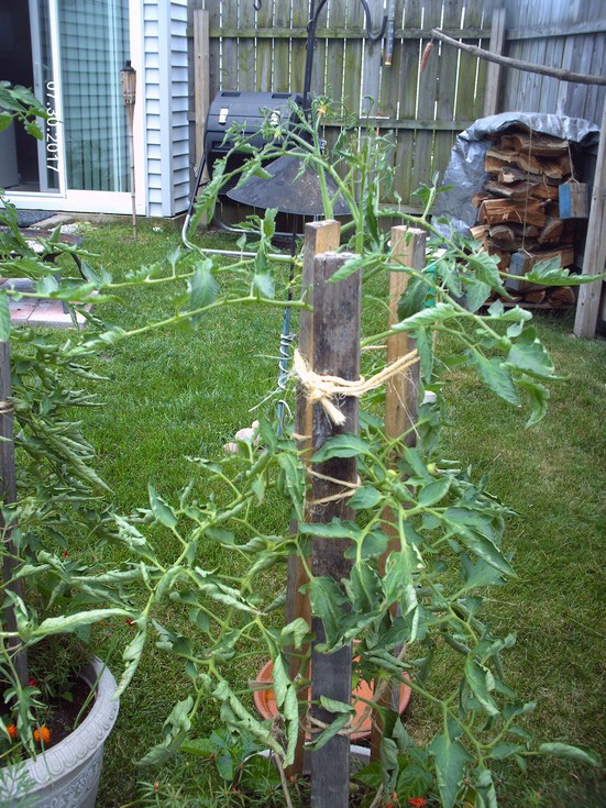 pics...! I also have previous shots of the the leaf curl showing on the same plants. These are all in my backyard. None of my front yard tomatoes are showing leaf curl and all of my tomatoes are receiving the same feeding. I only saw aphids and white flies on my backyard tomatoes.